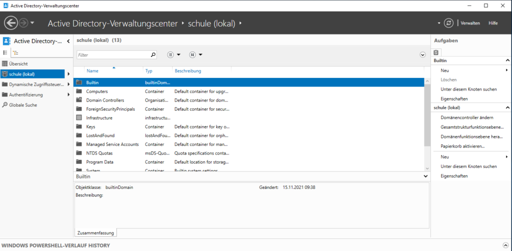 Das Active Directory Verwaltungscenter bietet wesentlich mehr Optionen zur Verwaltung einer Domäne. Daher findet man direkt nach dem Öffnen auch auf der rechten Seite die möglichen Aufgaben, welche in zwei Bereiche unterteilt werden.