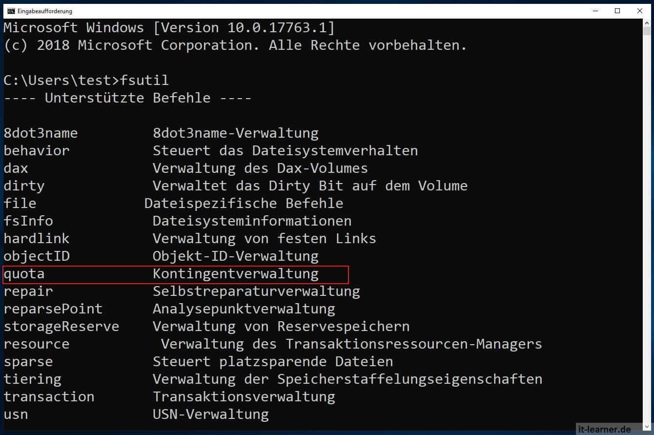 Ein weiterer Aufruf von fsutil mit quota liefert anschließend alle unterstützten Befehle. Für die Aktivierung und Konfiguration wird eine cmd mit administrativen Rechten benötigt.