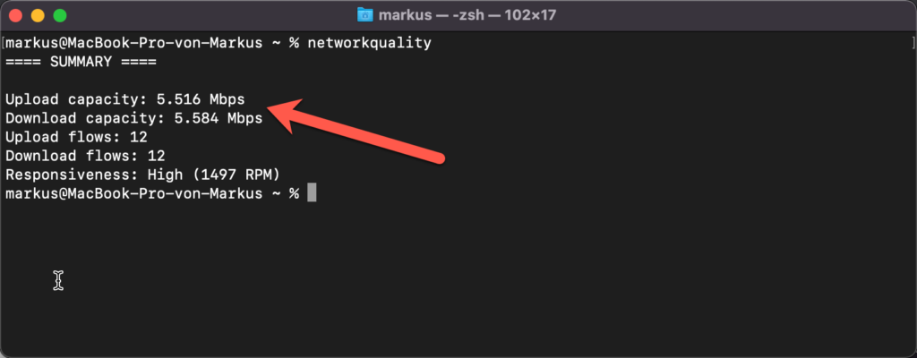 Gestartet wird das Programm regulär über das Terminal. Dies öffnet man entweder über den Launcher oder der Spotlights suche. Anschließend muss man nur networkQuality eintippen. Dieses kleine Tool liefert dann automatisch die UP- und Downstream Kapazitäten. Daneben erhält man auch noch zusätzlich die Responsivness. Also man erhält dann die Anzahl der aufeinanderfolgenden Netzwerk-Transaktionen, die mit dieser Verbindung aktuell möglich sind. Als Ergebnis liefert das Programm die Rückmeldung High, low oder Medium.