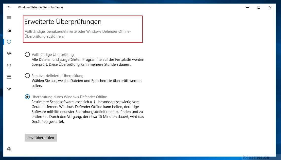 Bei der dritten Option Überprüfung durch Windows Defender offline wird die Prüfung während eines Neustarts durchgeführt.