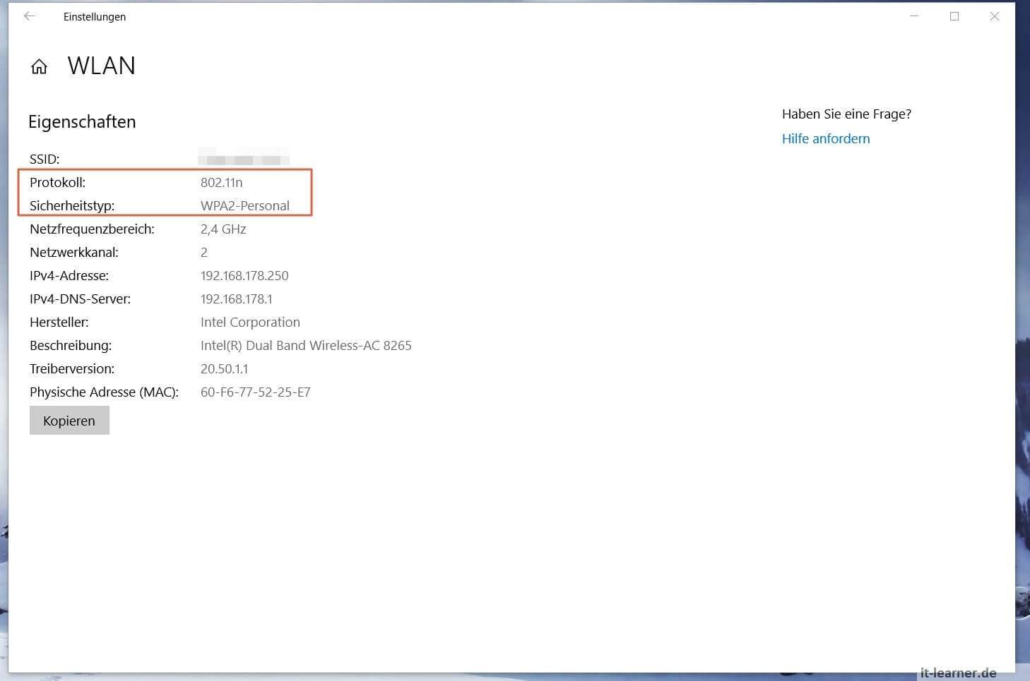 Sofern diese auch verschlüsselt sind, was in der Regel der Fall sein sollte und man auch den Key kennt, kann man sich damit verbinden. Über den Reiter Hardware Eigenschaften lassen sich anschließend verschiedene Eigenschaften auslesen, so unter anderem die SSID (Service Set Identifier) also der Name des WLAN Netzwerkes, das Protokoll, der Sicherheitstyp und natürlich notwendig auch die zugewiesene IPv4 Adresse.