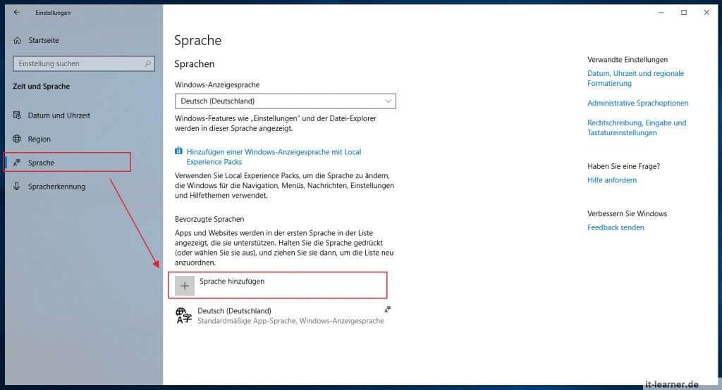 In diesem Menü oben ist direkt die aktuelle Anzeige-Sprache sichtbar. In meinem Beispiel Deutsch. Jetzt möchte man das Windows System aber in einer anderen Sprache, wie Englisch, bedienen. Dazu muss die Sprache erst dem System hinzugefügt werden.